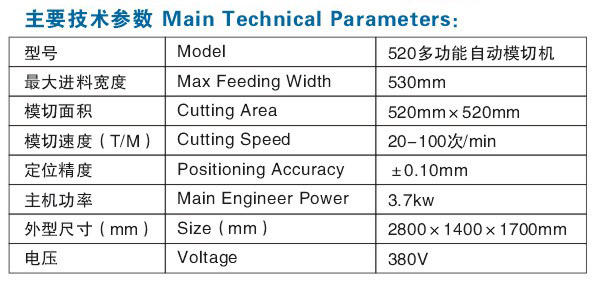 The machine is equipped with an independent material feeding(the material feeding machine enjoys the functionof sticking).lmported eleorted motor is adopted to discharge waste.Materials can be fed with a conveyer belt,and die-cut to cut fully.